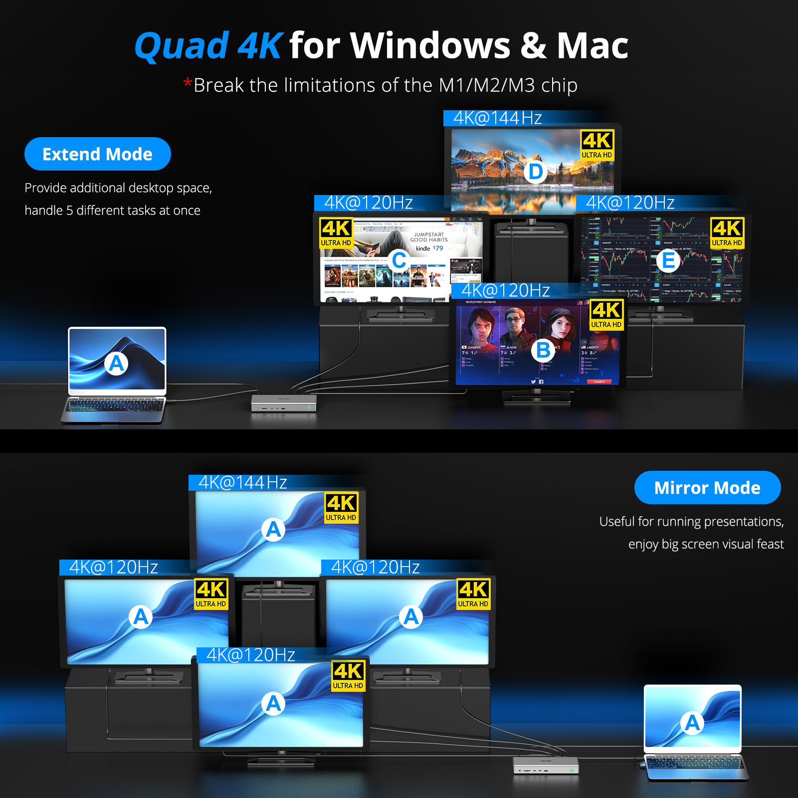 WAVLINK USB-C 筆電擴充底座採用先進技術及最新 DisplayLink DL7400 晶片組,安全繞過蘋果三螢幕顯示限制,實現四螢幕顯示支援。雙螢幕 8K@60Hz 或四螢幕 4K 顯示,帶來清晰銳利的文字、鮮明生動的影像及更高的像素密度。