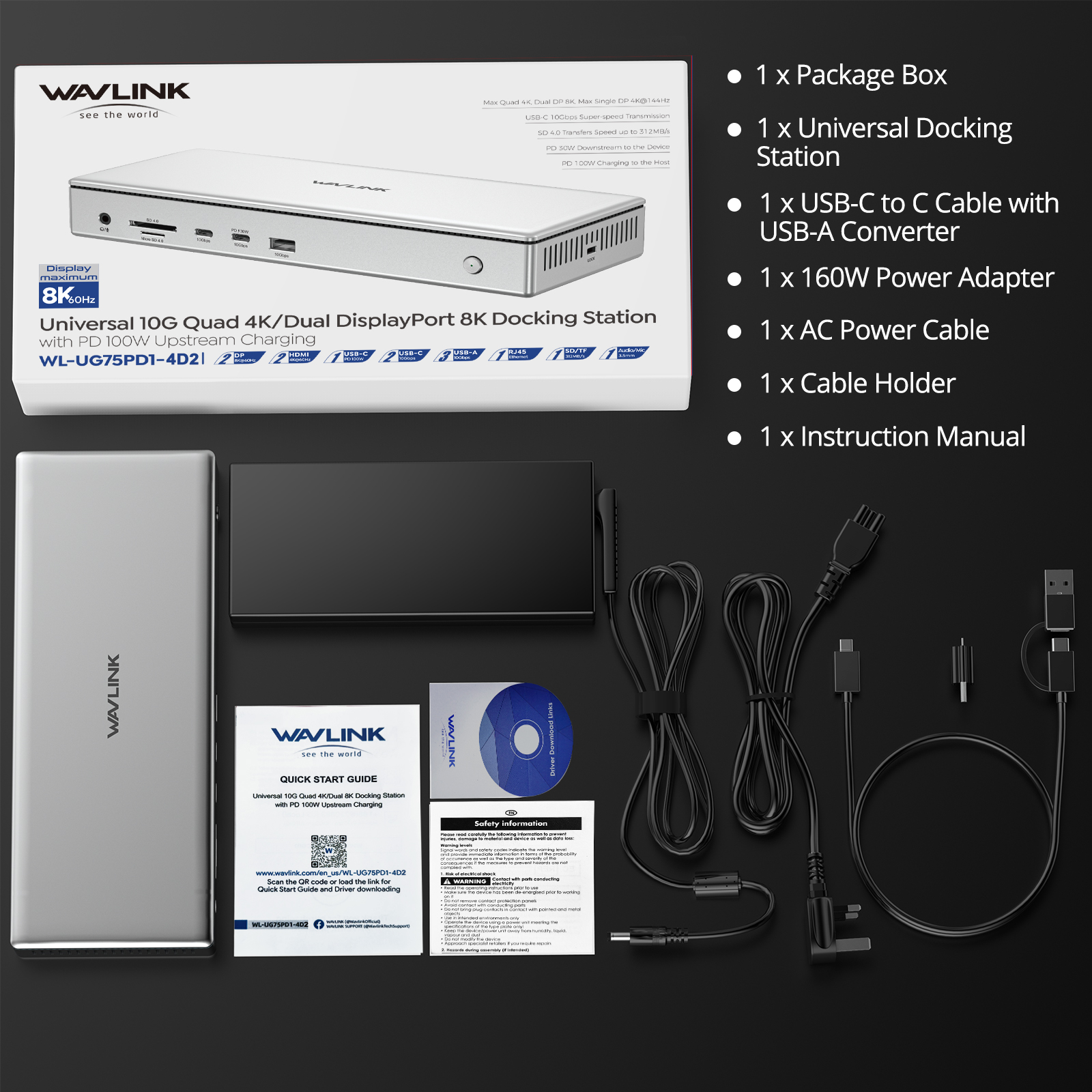 WAVLINK 四螢幕擴充底座是您筆電/電腦的終極配件,配備 4 個 DisplayPort++(1.4) 端口、2.5G 乙太網路埠、USB-C 3.2(10Gbps)、USB-C 3.2(10Gbps+PD30W)、3 個 USB-A 3.1(10Gbps)、SD/TF4.0 卡槽(312MB/s)、DC 電源輸入、100W PD 充電埠及 3.5mm 音訊與麥克風插孔。此產品需安裝驅動程式,請至 DisplayLink 官方網站下載。
