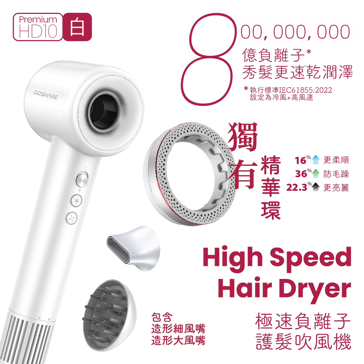 1. 角鯊烷精華環, 平滑噴嘴及擴散噴嘴 2. 動力: 110,000 轉無刷馬達 3. 溫度控制技術 4. 8 億負離子護髮 5. 創新設計與體驗 6. 寧靜 7. 12 種組合, 滿足各種造型需求