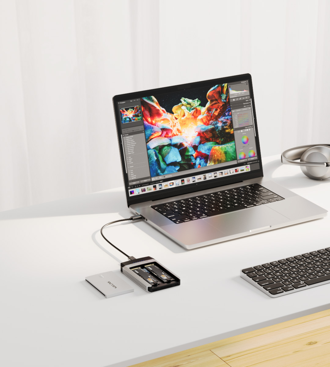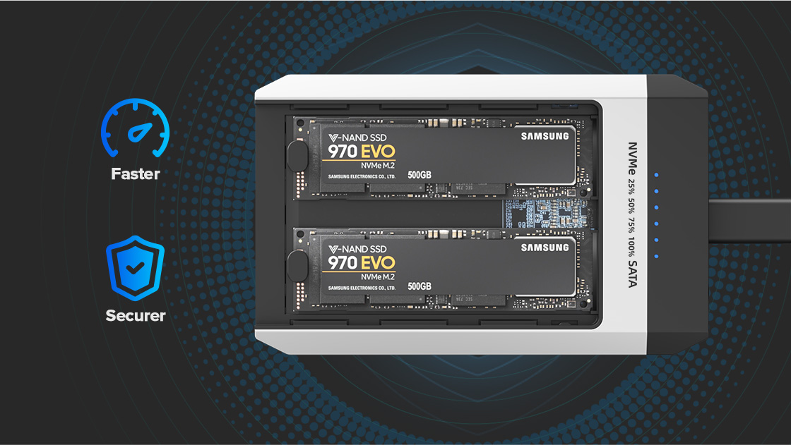 這款雙槽 SSD 硬碟盒可透過磁碟工具或 RAID 助理建立 RAID,大幅縮短資料讀取和儲存時間,並提高安全性。
