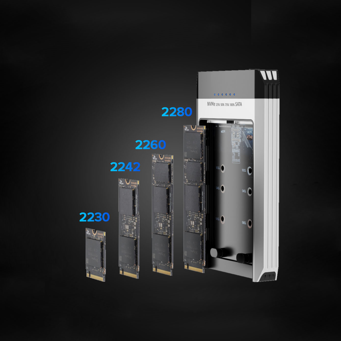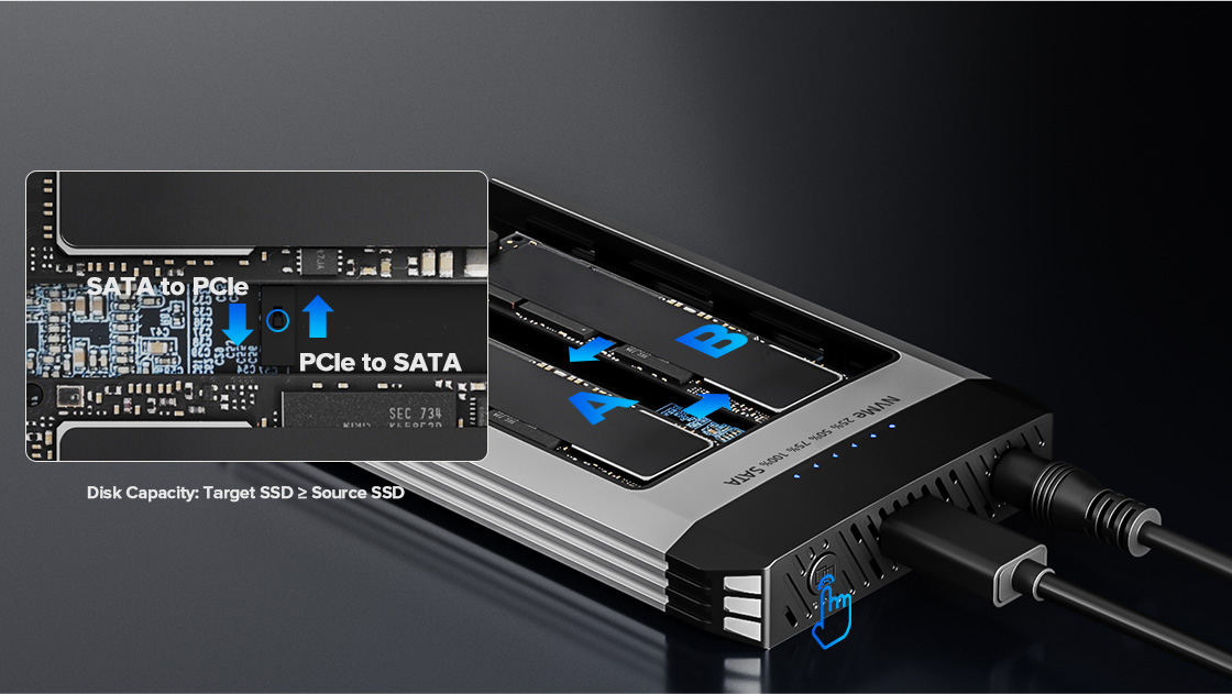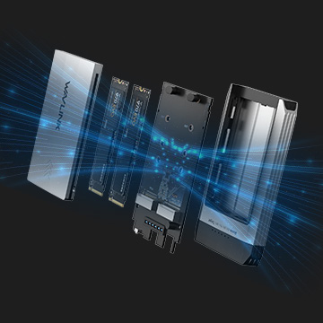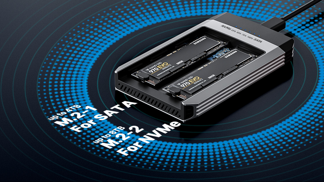 雙 SSD 固態硬碟盒有兩個 M.2 SSD 插槽,一個用於 PCIe NVMe SSD(最高支援 8TB),另一個用於 SATA SSD(最高支援 4TB)。可同時插入兩個 SSD,快速擴充電腦的儲存容量。