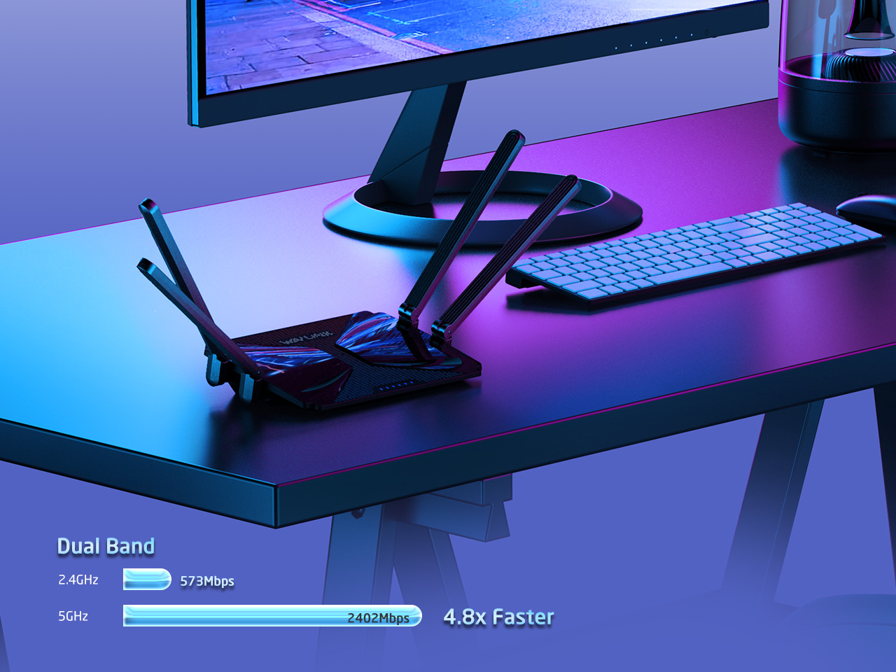 支援TWT(Target Wakeup Time)技術,以節省功耗。 提供約2975Mbps的總網路速度,2402Mbps@5GHz和573Mbps@2.4GHz